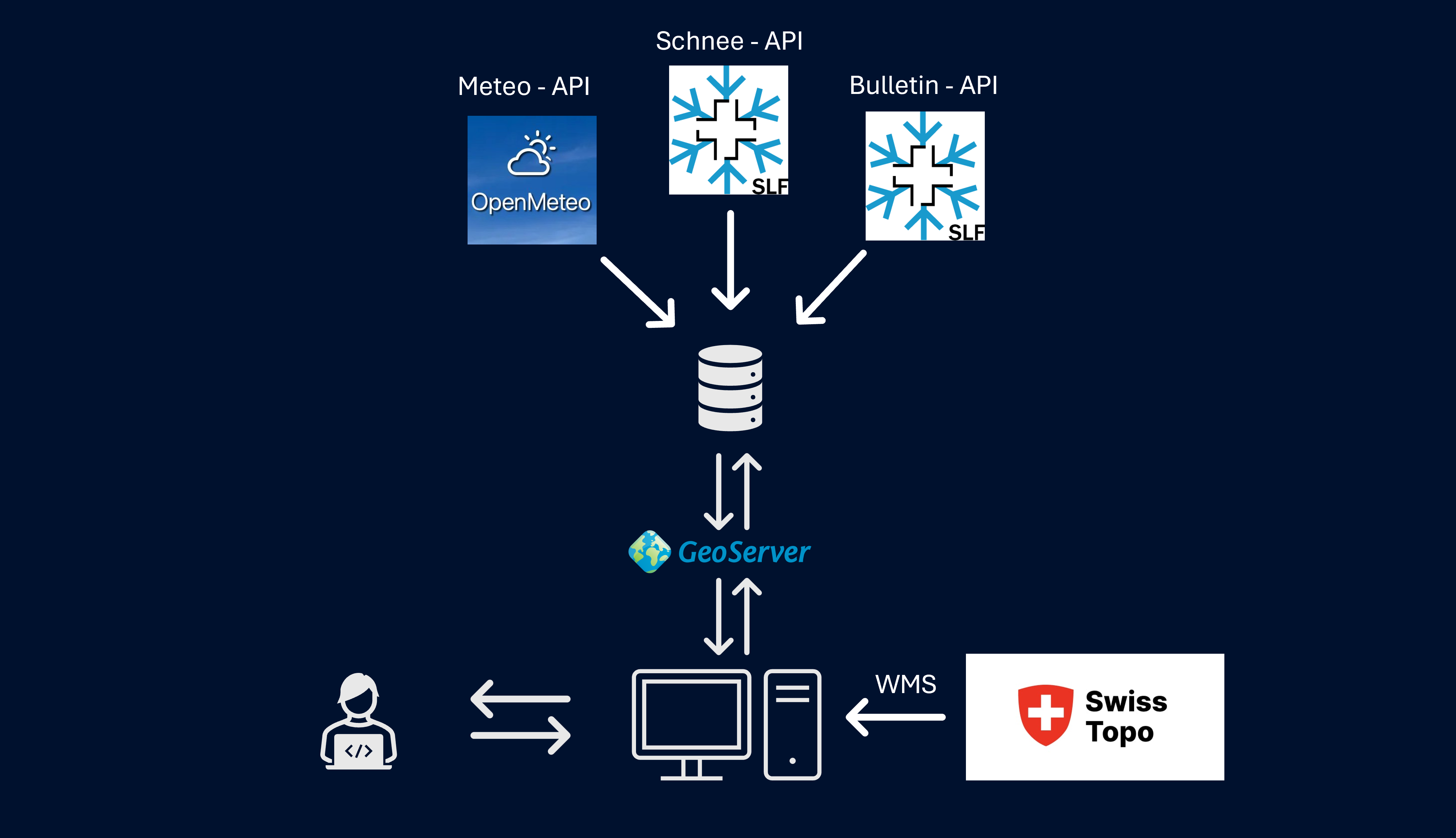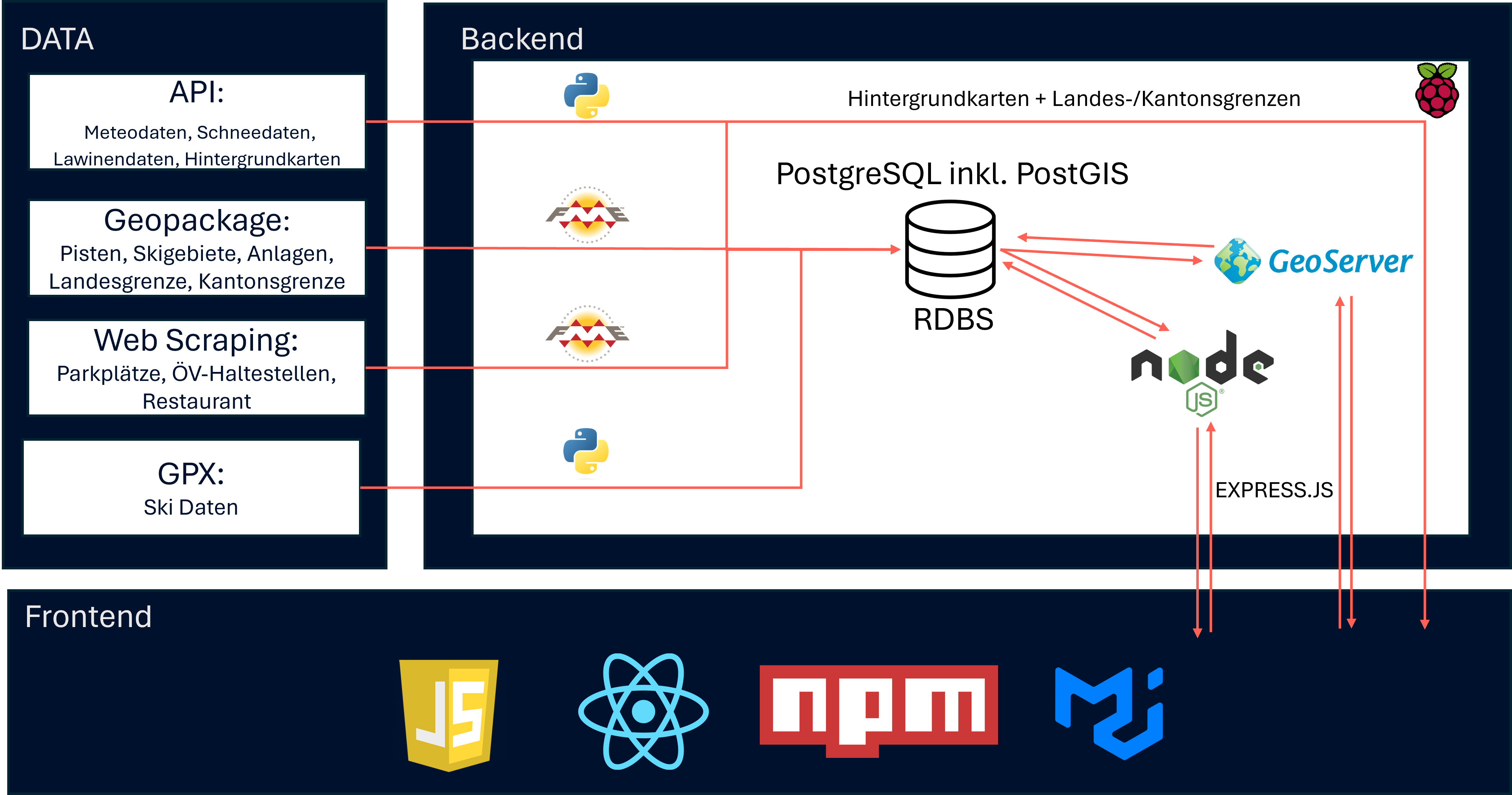 Eine vollständige Geodateninfrastruktur (GDI) umfasst das Backend, das Frontend sowie die verwendeten Bibliotheken und API-Schnittstellen. Das folgende Schema zeigt die entwickelte und genutzte GDI der Alpine Ace-Ski App.