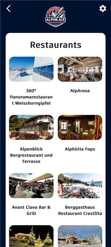 Die Restaurants des Skigebietes werden in Kacheln angeordnet. In diesen Kacheln ist jeweils ein Bild des Restaurants und darunter der Name. Nach dem Anklicken einer Kachel wird das gewählte Restaurant in der Karte dargestellt. Unterhalb der Karte werden die Informationen zu Öffnungszeiten und Kontaktinformationen wie Telefonnummer oder Webseite angezeigt.