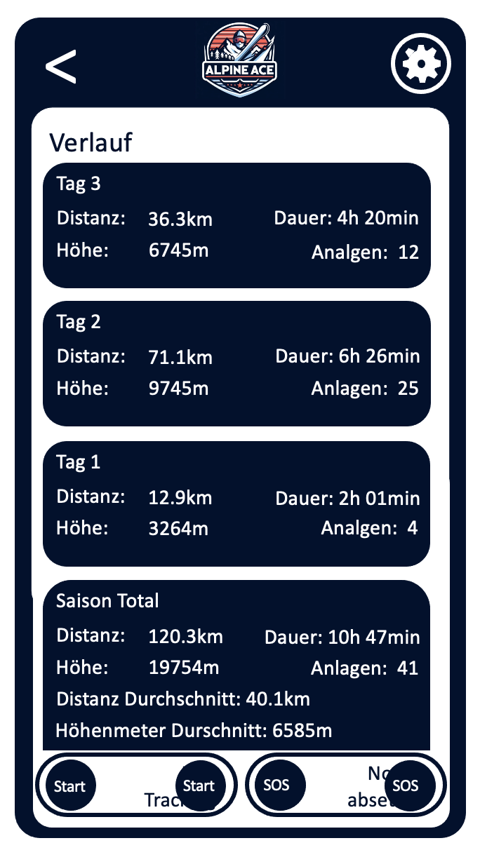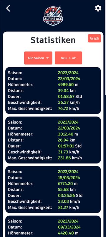 Im Statistik-Menü finden Sie alle relevanten Informationen zu vergangenen Skitagen. Hier können Sie Vergleiche über die gesamte Saison hinweg anstellen, verschiedene Saisons miteinander vergleichen oder einzelne Tage im Detail auswerten.