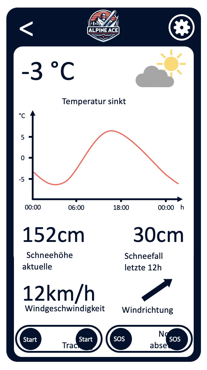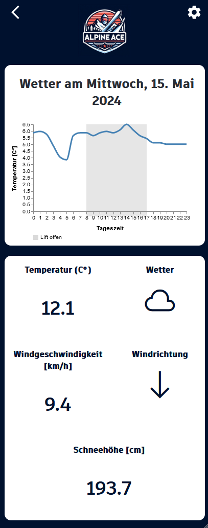 Das Wetter-Menü ist in zwei Bereiche unterteilt: Im oberen Teil wird die Wettervorhersage präsentiert, während im unteren Teil die aktuelle Wettersituation dargestellt wird. Die Vorhersage wird in einem Diagramm visualisiert, wobei die Betriebszeiten der Skilifte grau hervorgehoben sind, um den Fokus auf die relevanten Zeiträume zu lenken. Der Bereich mit den aktuellen Informationen befindet sich im unteren Abschnitt der App. Windrichtung und Wetter werden dabei durch Symbole veranschaulicht.