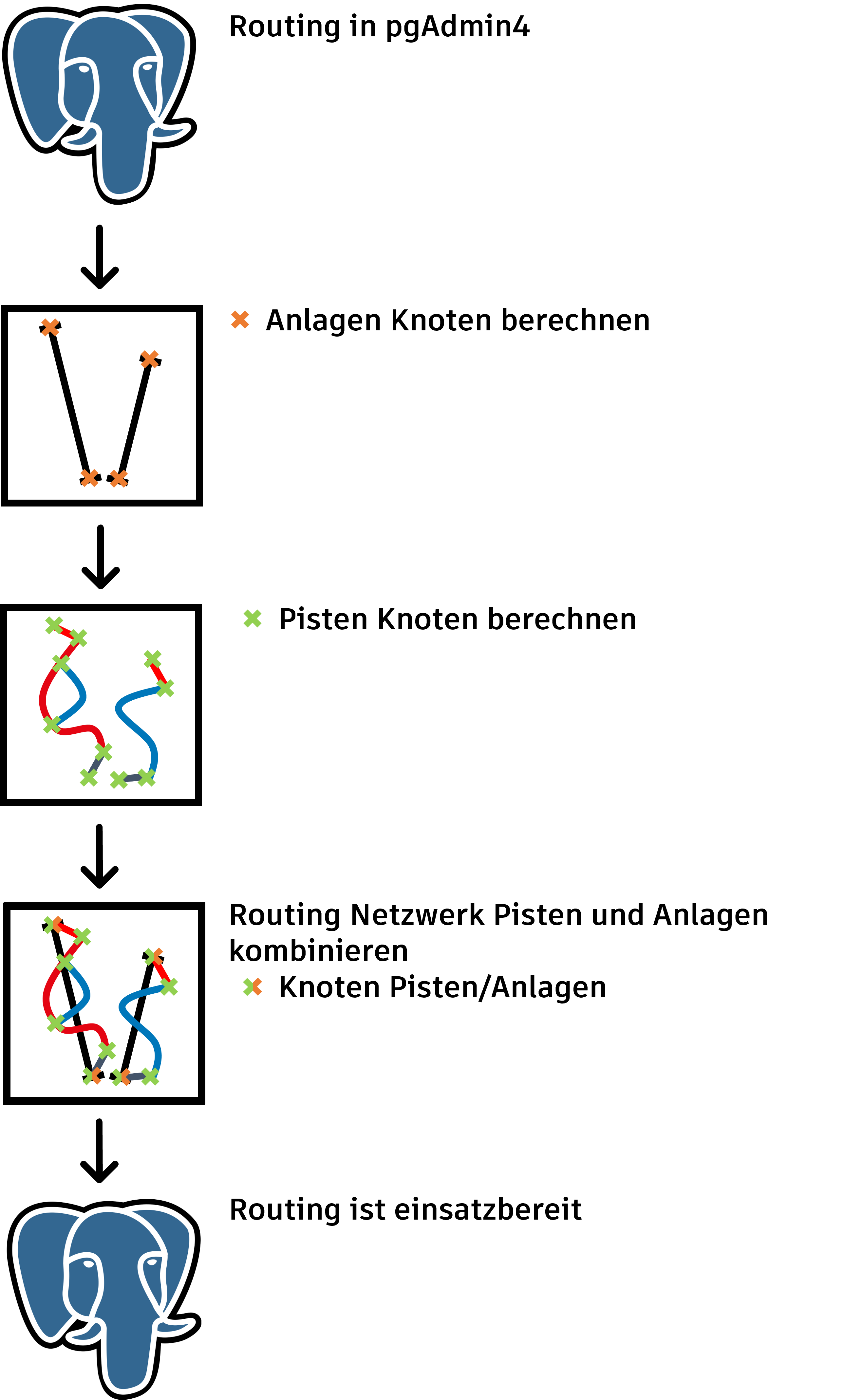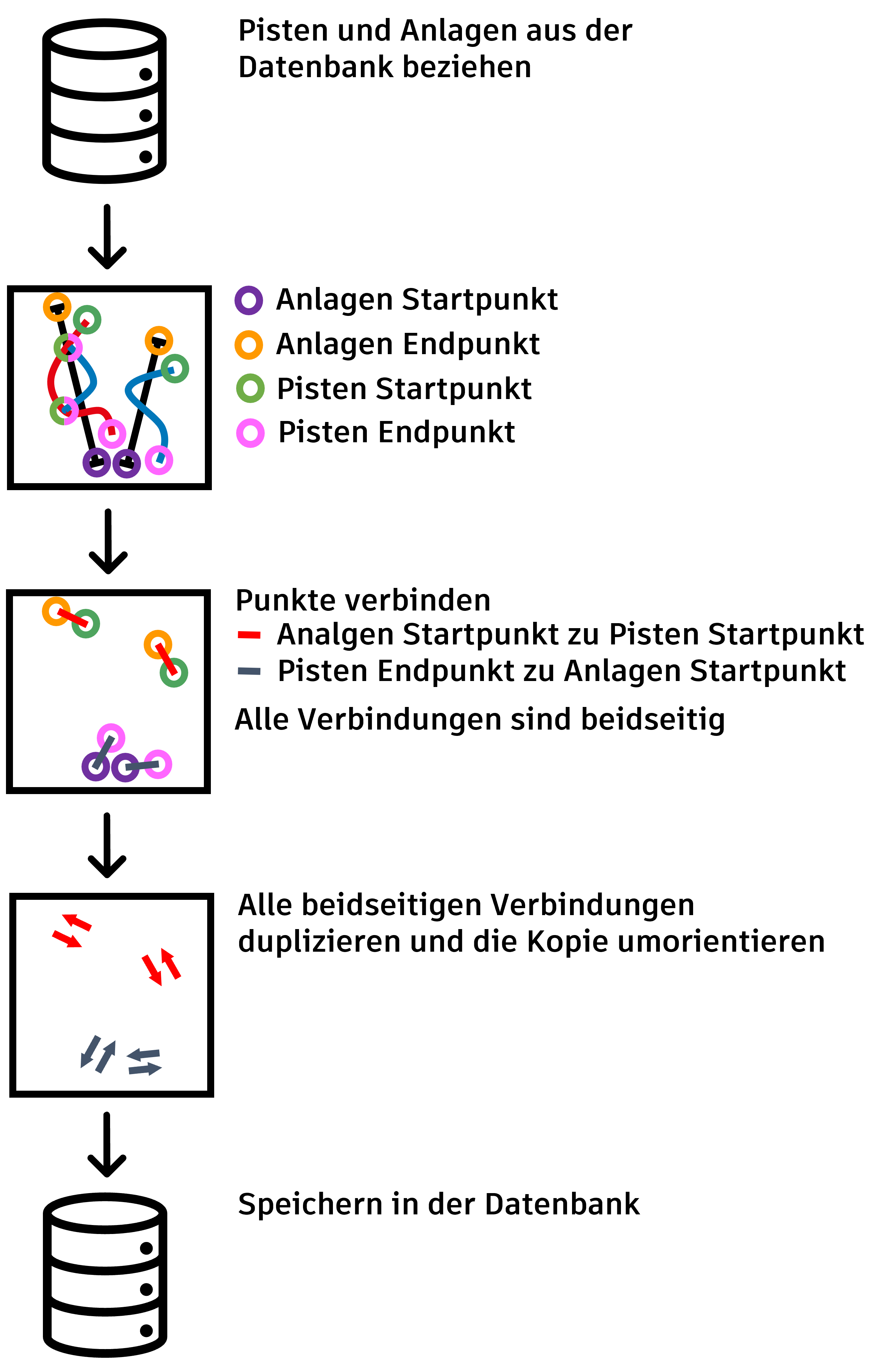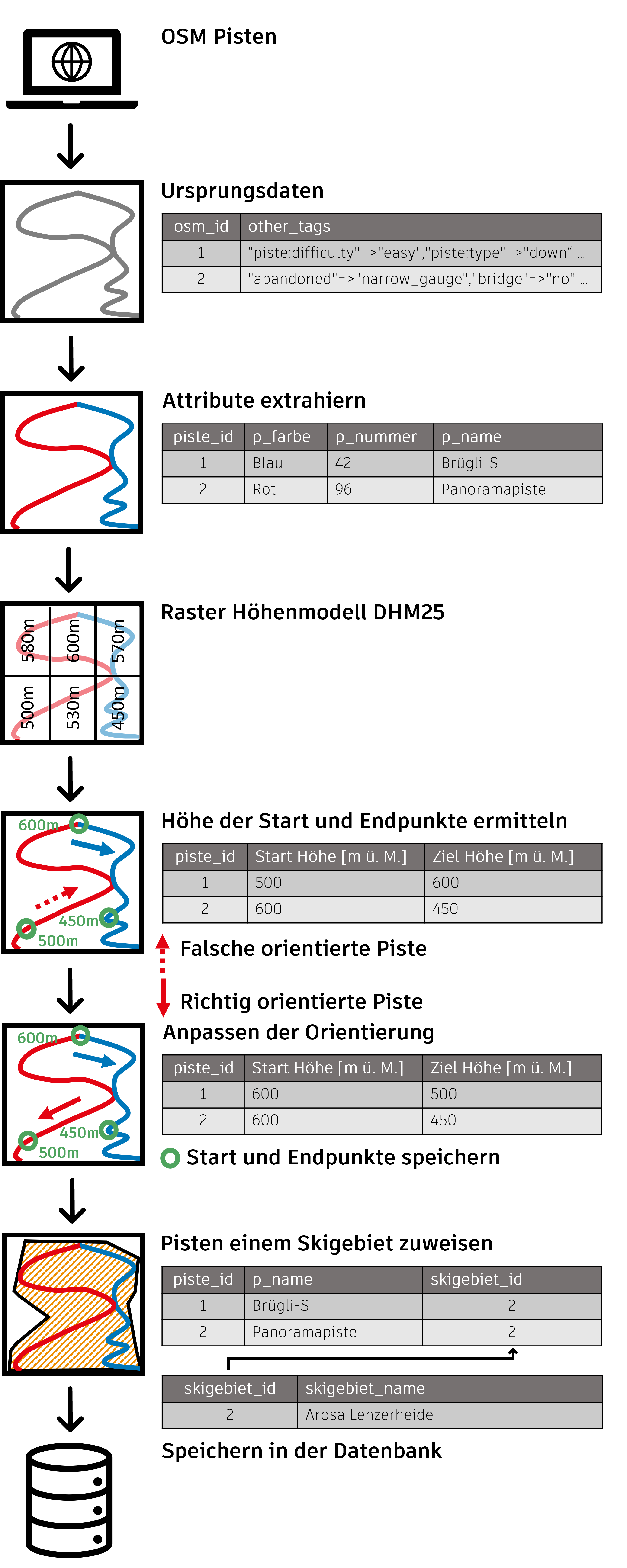 Die Attribute sind für dieses Projekt so noch nicht nutzbar, da viele wichtige Informationen im Attribute other_tags sind. In der FME Workbench wird zuerst der Schwierigkeitsgrad extrahiert und im Attribut p_farbe festgehalten. Dasselbe passiert mit der Pistennummer p_nummer und Pistenname p_name. Multilines werden aufgesplittet in Linien. Für jede Linie wird eine ID erstellt, die piste_id. Die nicht mehr benötigten Attribute werden gelöscht. Für das Routing ist es später wichtig in welche Richtung die Piste verläuft. In einem benutzerdefinierten Transformer, dem Höhe_Start_und_Endpunkt_herausfinder, wird die Höhe des Starts und Endpunkts ermittelt. Die Höhe wird vom DHM25 abgegriffen. Ist die Höhe des Startpunktes tiefer als die des Endpunktes, wir die Orientierung der Piste umgedreht. Danach werden alle Pisten einem Skigebiet zugeordnet. Ist dies nicht möglich, wird diese Piste aussortiert. Bevor die Pisten gespeichert werden, wird das Attribut p_einweg vergeben. Dieses legt fest ab wann eine Piste als Einweg eingestuft (p_einweg = true) wird oder ob die Piste beidseitig befahrbar ist (p_einweg = false). Die Höhendifferenz wird als UserParameter angegeben vor dem Start des Prozesses. Der Standardwert ist 15m. Die Start- und Endpunkte werden in der Tabelle pisten_startpunkt, respektive pisten_endpunkt gespeichert und werden danach im Prozess Routing_geoserver.fmw.