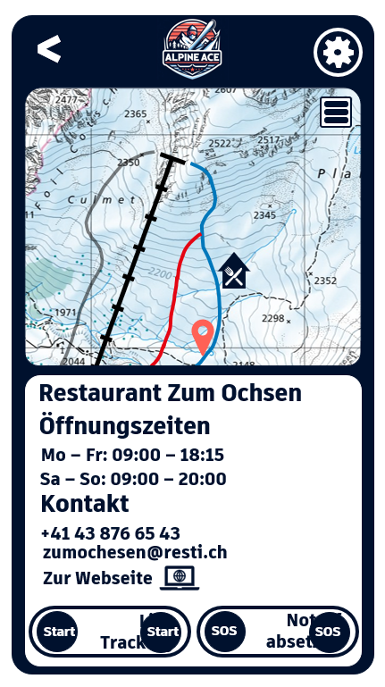 restaurantAnfrageLayer zugeordnet. Dieser bekommt dann die Stil Eigenschaften restaurantStyle zugwiesen Dies umfasst das ein Icon aus einer svg Datei. Die weiteren Informationen vom Feature werden extrahiert, damit diese unterhalb der Karte dargestellt werden können. Von der Start Position der Karte wird anschliessend auf die Restaurant Position gezoomt mittels einer Animation. Unterhalb der Karte werden dann die Informationen des Restaurants angezeigt.Folgende Features werden in der AlpineAce V2.0 eingebaut. Die Datenbank ist dafür bereits ausgelegt, was die Implementierung der Features vereinfachen sollte.