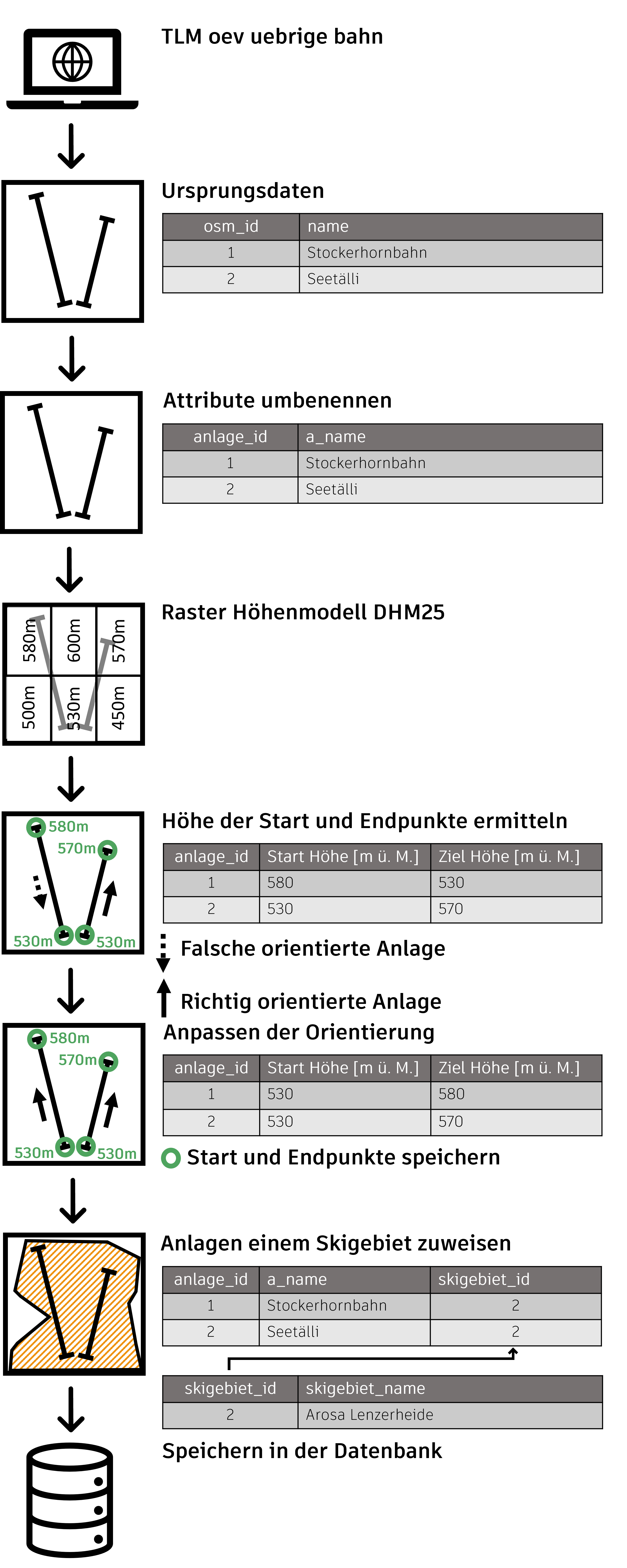DHM25_MM_ASCII_GRID.zip von der Swisstopo.Die Datei dhm25_grid_raster.asc ist mit mehr als 844 MB zu gross für das GitHub repository. Deshalb gibt es unter DB_PG ein Download Python Datei ASCII_Hoehenmodell_download.py. Dies lädt das DHM25 automatisch herunter, entzippt dieses und speichert es im Ordner ASCII_Hoehenmodell. Das Höhenmodell wird nur im FME Prozess geoserver_Datenimport.fmw verwendet, für die Richtungsbestimmung der Analgen und Pisten. Deshalb werden diese nicht in die Datenbank importiert.