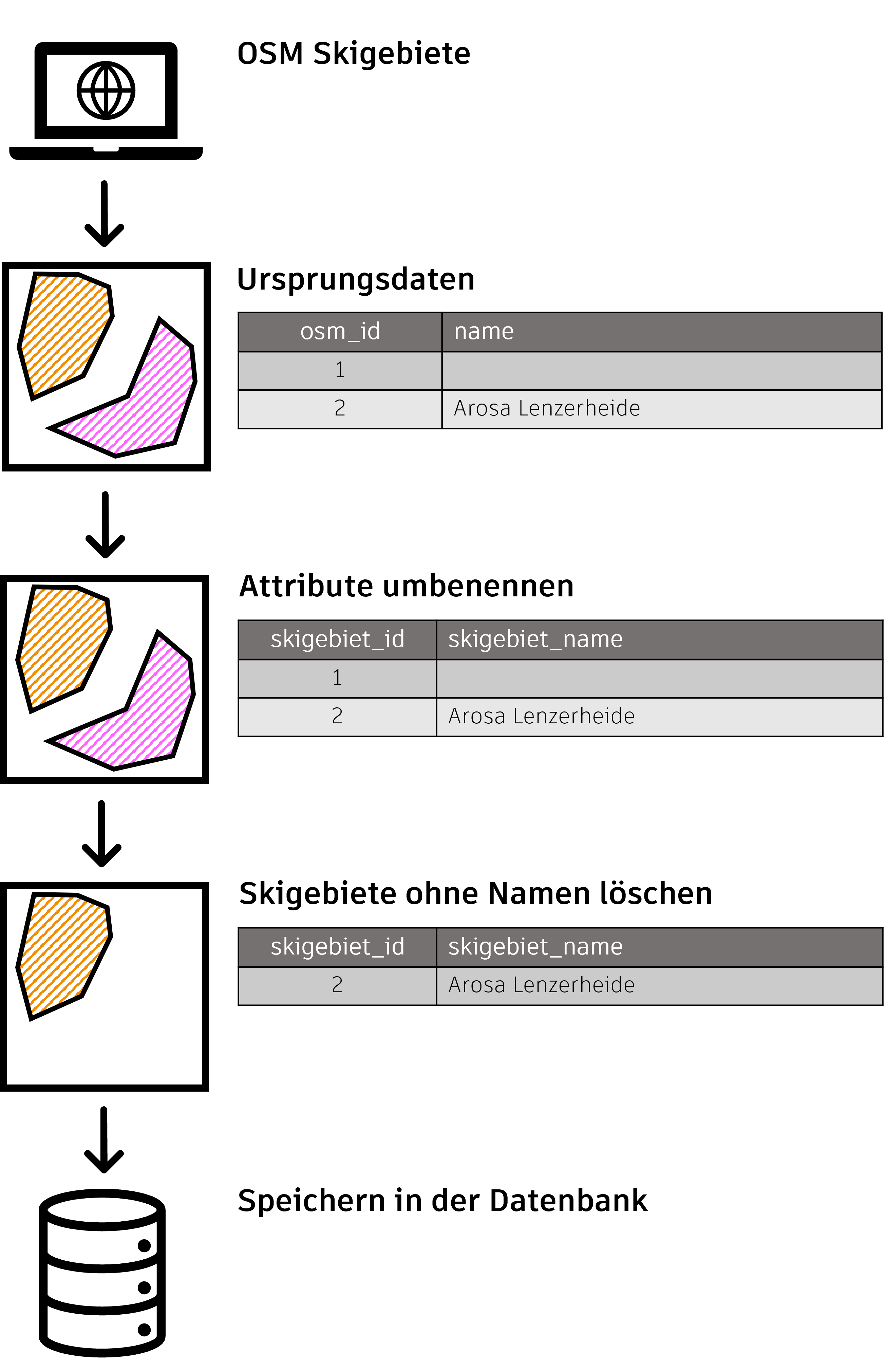 Die Flächen werden in der Workbench gefiltert auf Skigebiete (es gibt Pisten die als Flächen vorhanden sind in OSM). Das Attribut skigebiet_name und die ID skigebiet_id wird vergeben. Diese ID wird als Verknüpfung verwendet um die Zuordnung zum Skigebiet zu ermöglichen. Die Skigebiete werden anschliessend in der Tabelle skigebiet gespeichert. Die Skigebiete werden bis jetzt im Projekt nicht grafisch dargestellt. Sie dienen lediglich der Verknüpfung von andern Daten.